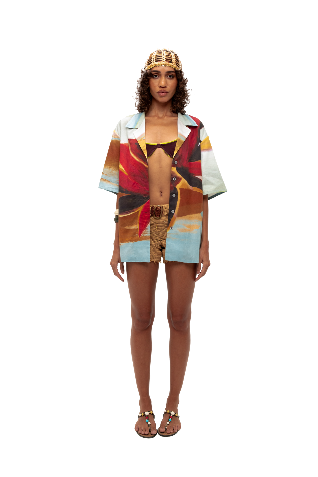 Linen loose halter top, with a detachable hand-beaded flower appliqué, to be styled on the...