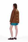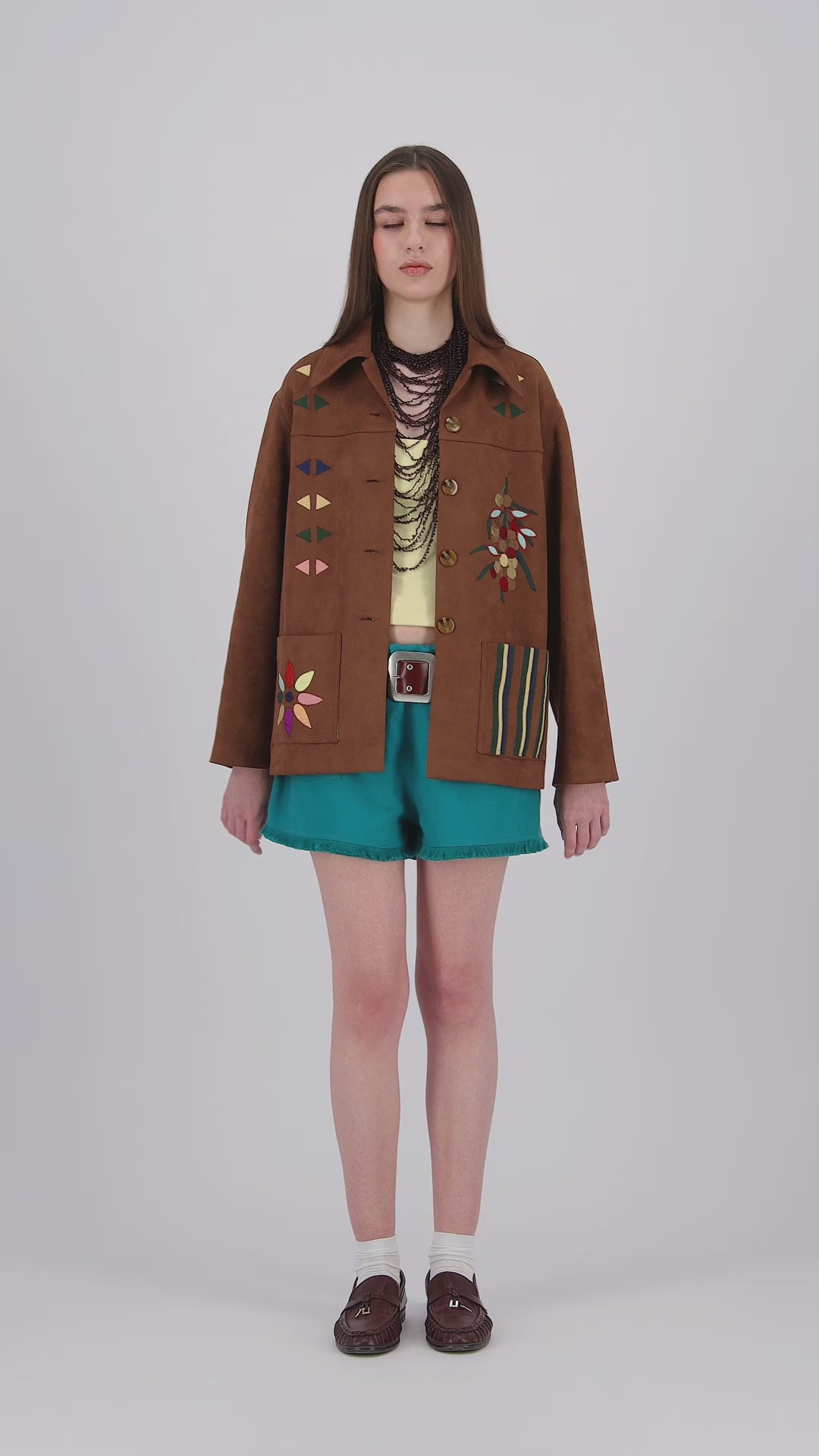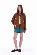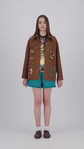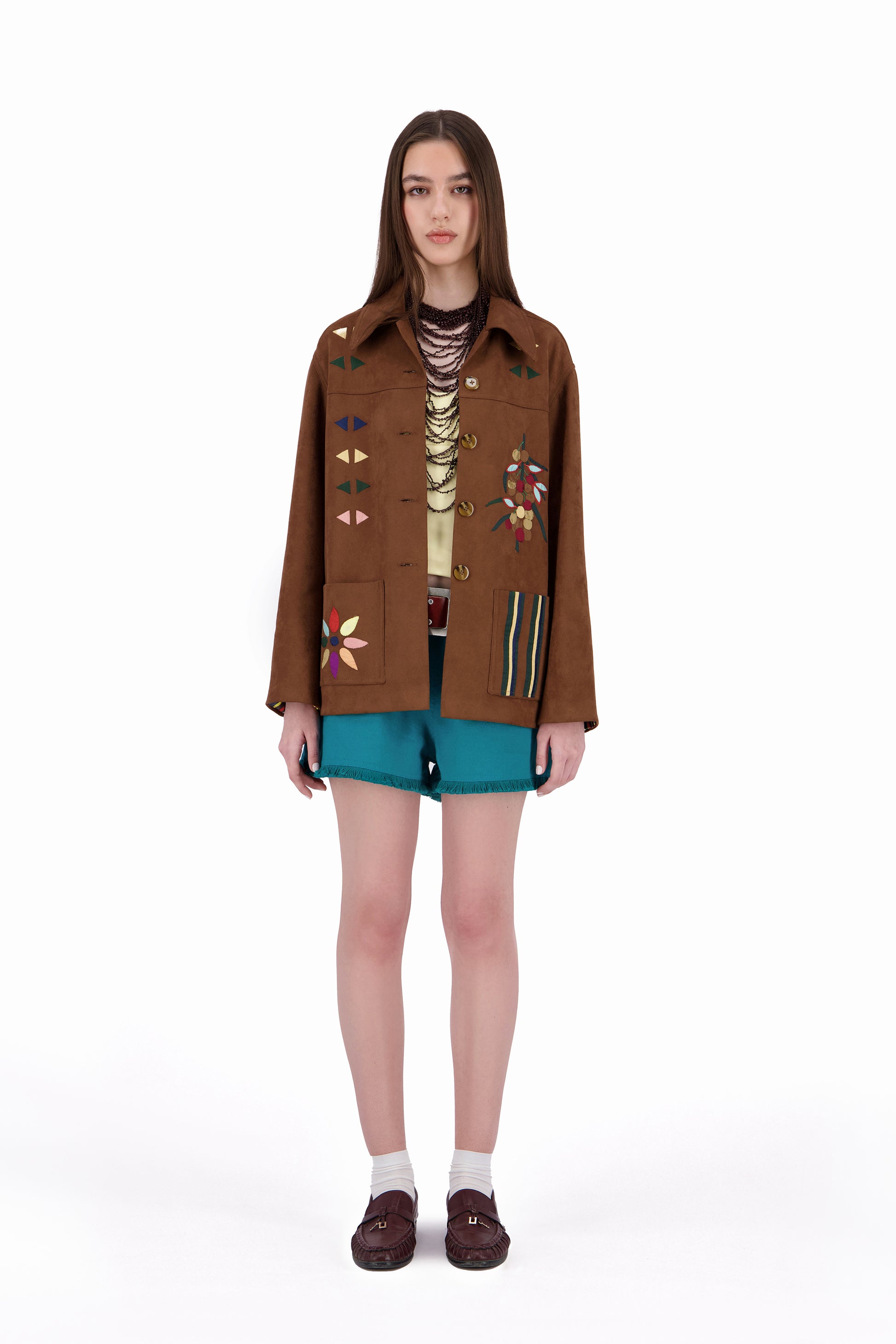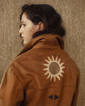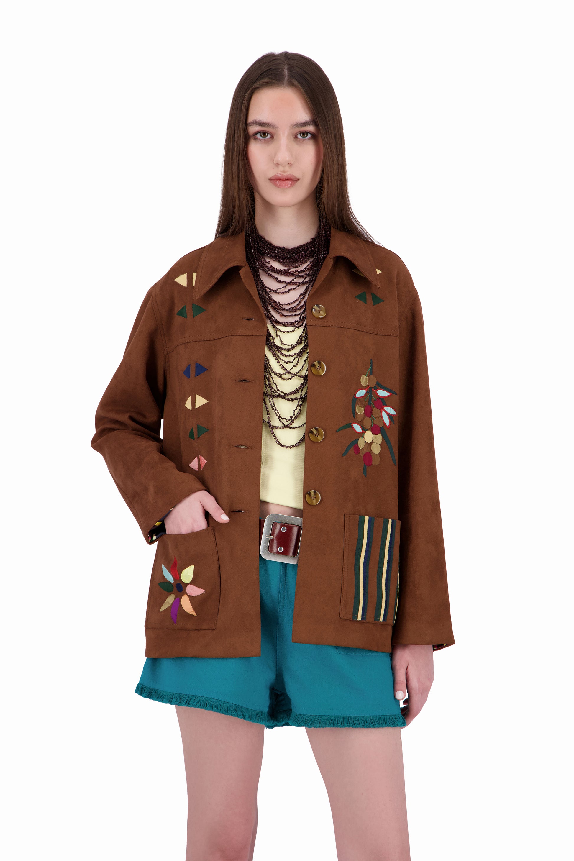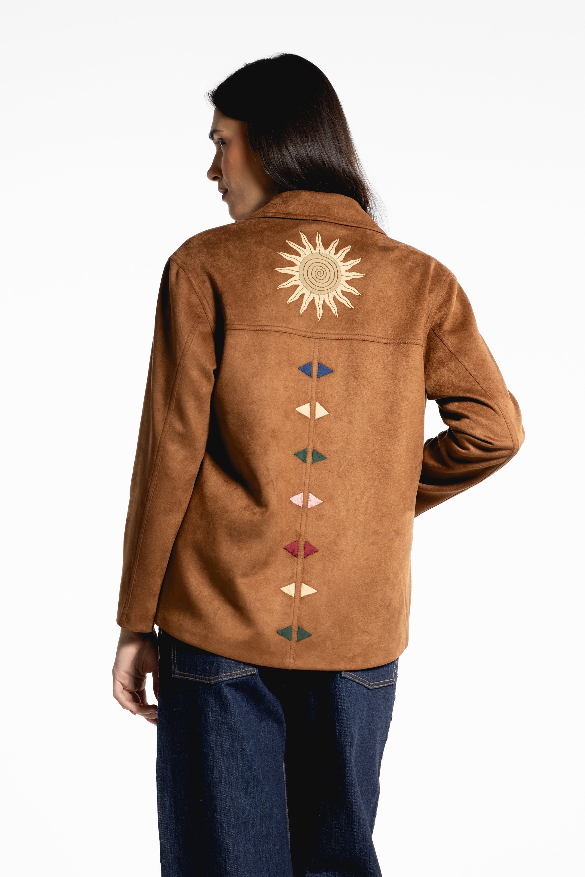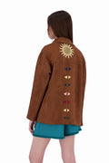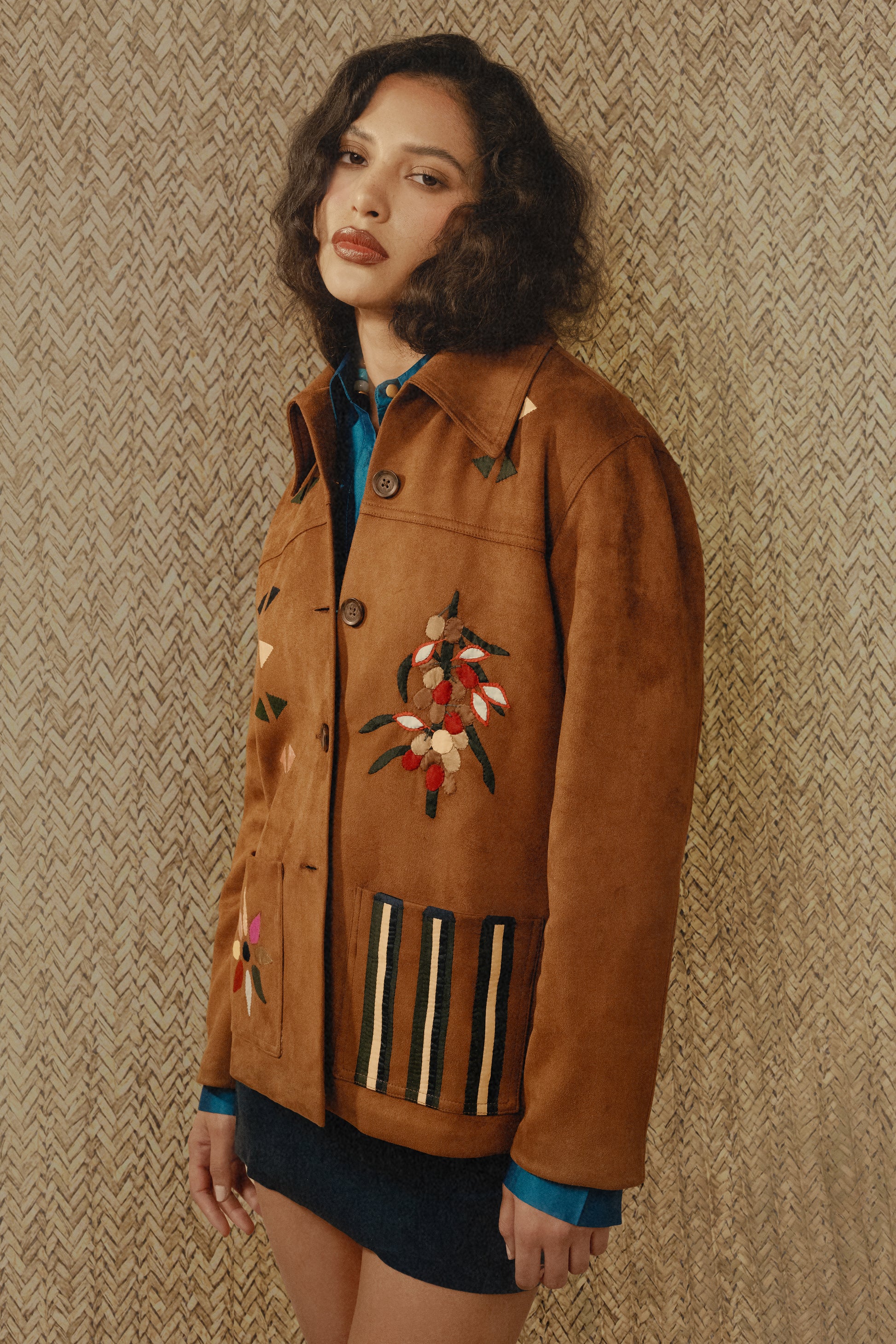 The Galila faux suede light-weight kheyameya jacket is crafted as a canvas for intricate handwork, with every panel carefully embellished using appliquéd kheyameya embroidery. Each motif is hand-cut and individually sewn, building the design layer by layer through a slow, deliberate process that honors traditional techniques. This piece is finished with a custom-printed lining, of colorful stripes, creating a hidden layer of pattern that mirrors the detail and intention of the exterior.