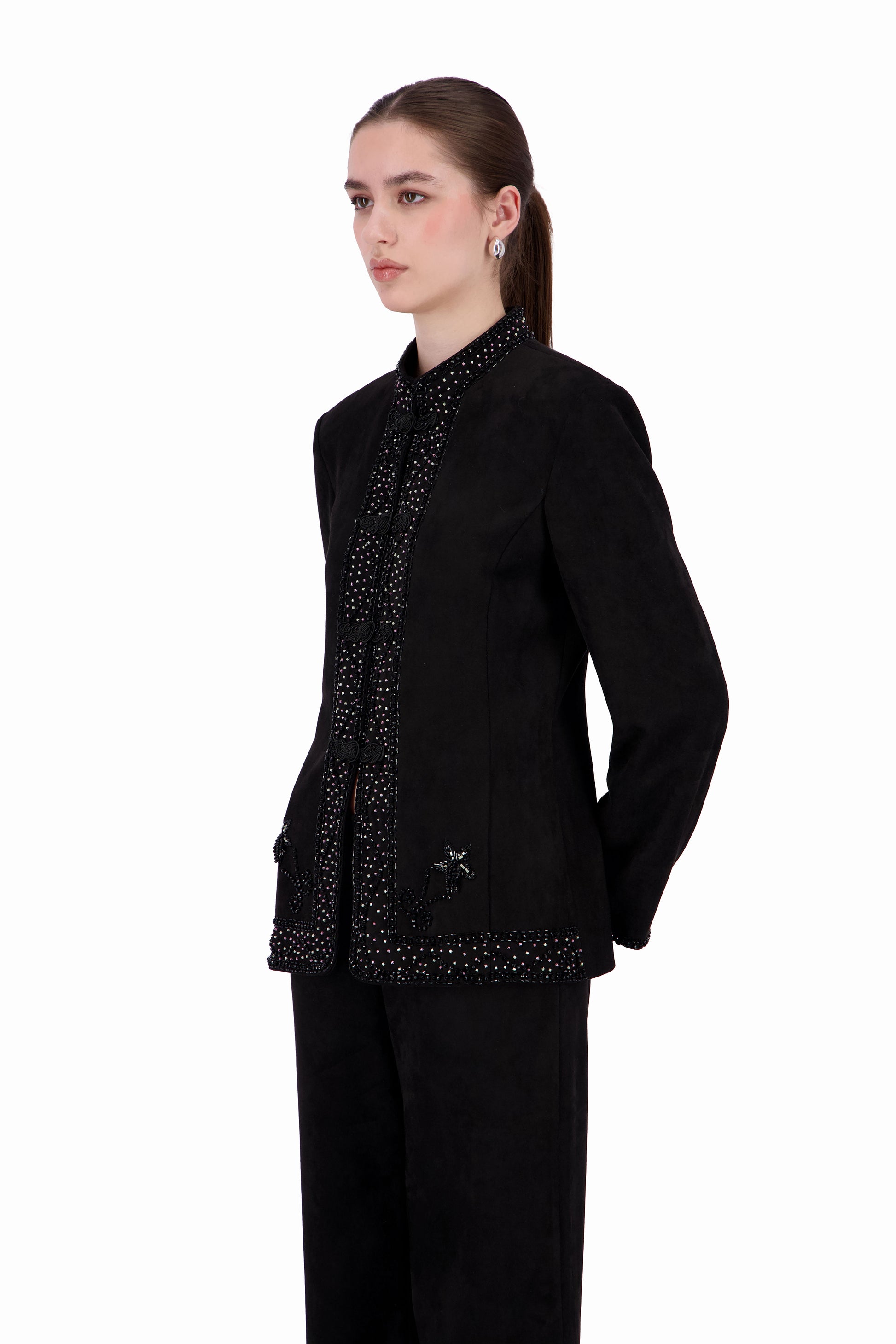 The Kahila hand-embroidered jacket brings together meticulous craftsmanship and a spirited elegance. A mélange of crystal beads in black, pale yellow, and soft pink is individually sewn by hand to form the motif with precise craftsmanship. The design features a flattering, fitted waistline silhouette that creates a structured yet feminine shape. It is completed with handmade cord buttons, adding a soft, tactile finish. Inside, a custom-printed lining of colorful dots, bringing a lively, offbeat charm to the piece.