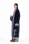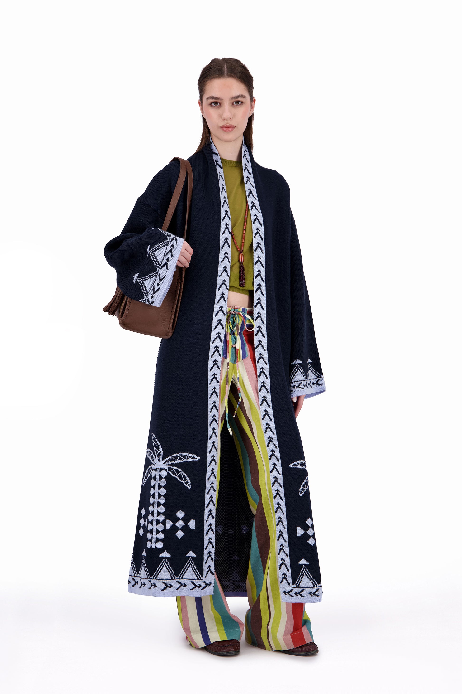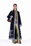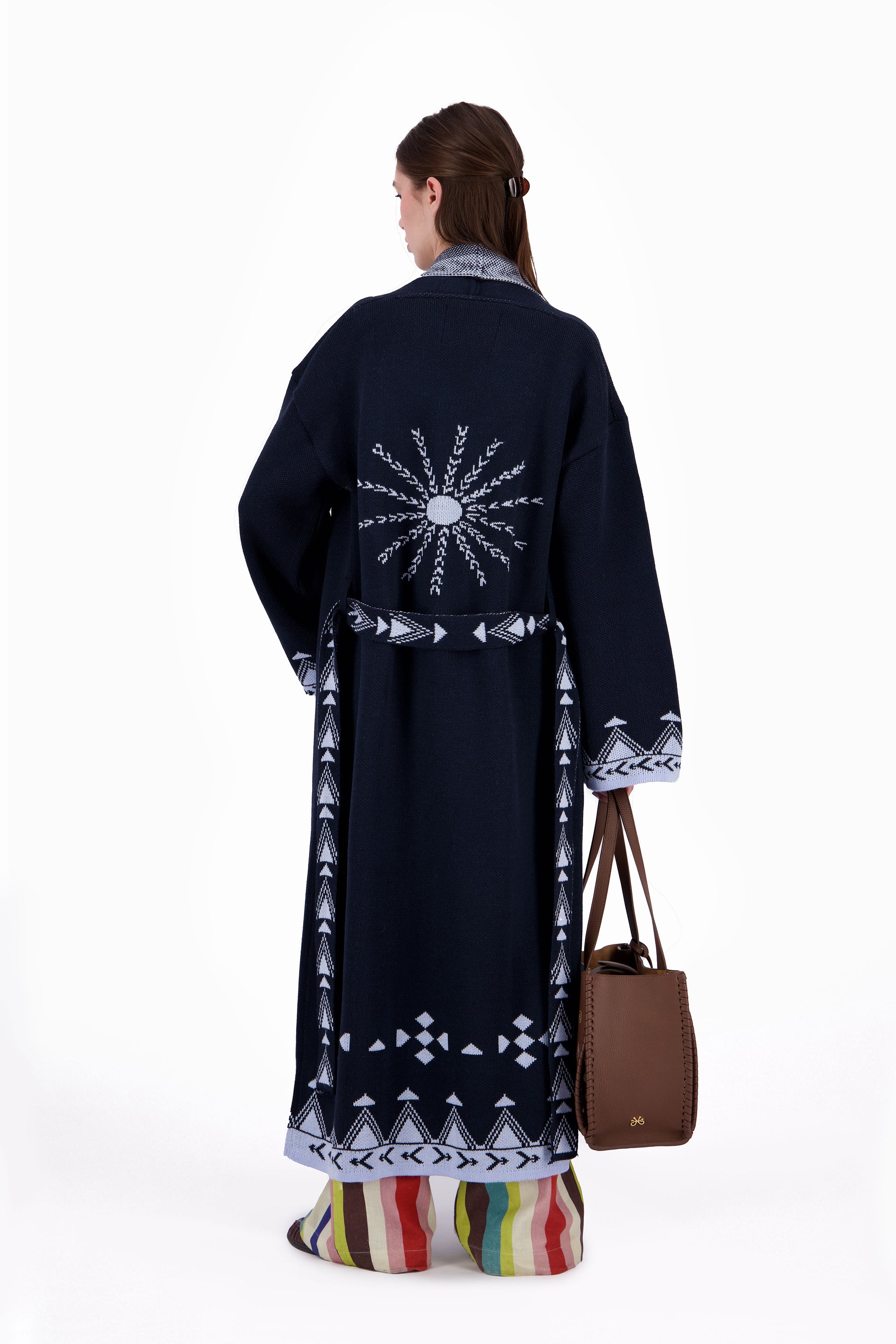 The Rizq Jacquard Knit Maxi Cardigan is crafted in a soft tricot knit, featuring playful RebelCairo motifs woven along the borders in denim blue. Designed as a statement piece, it is finished with a matching belt that can also be styled as a scarf, offering multiple ways to wear: cinched closed, worn open, or layered for the day or night.