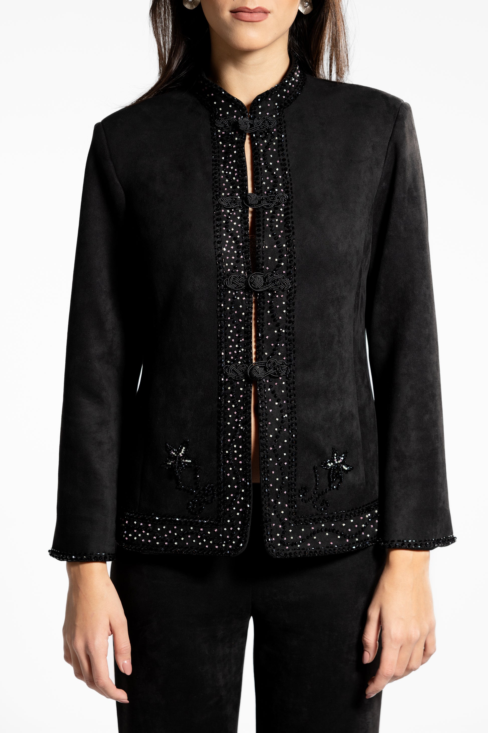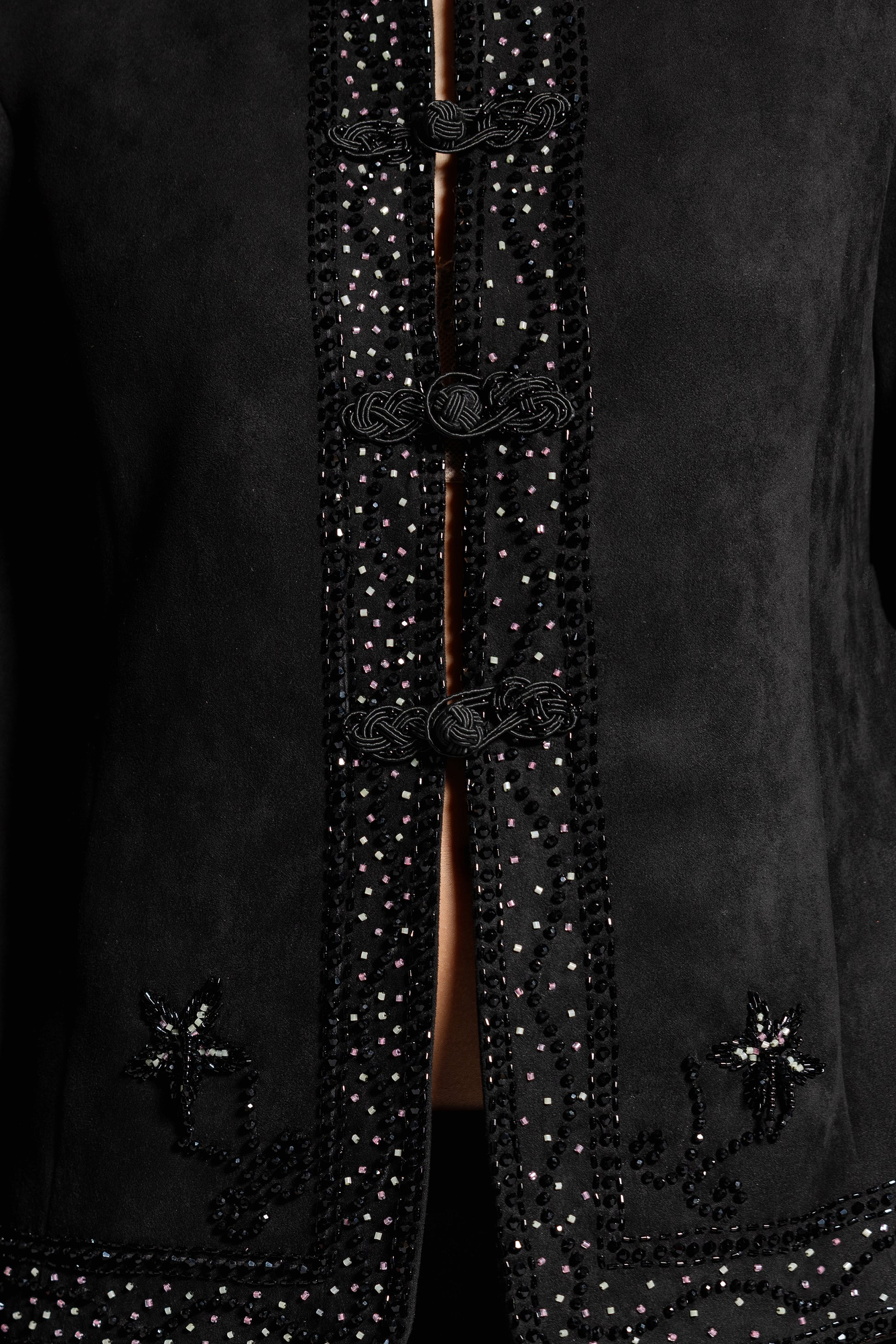 The Kahila hand-embroidered jacket brings together meticulous craftsmanship and a spirited elegance. A mélange of crystal beads in black, pale yellow, and soft pink is individually sewn by hand to form the motif with precise craftsmanship. The design features a flattering, fitted waistline silhouette that creates a structured yet feminine shape. It is completed with handmade cord buttons, adding a soft, tactile finish. Inside, a custom-printed lining of colorful dots, bringing a lively, offbeat charm to the piece.