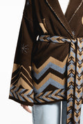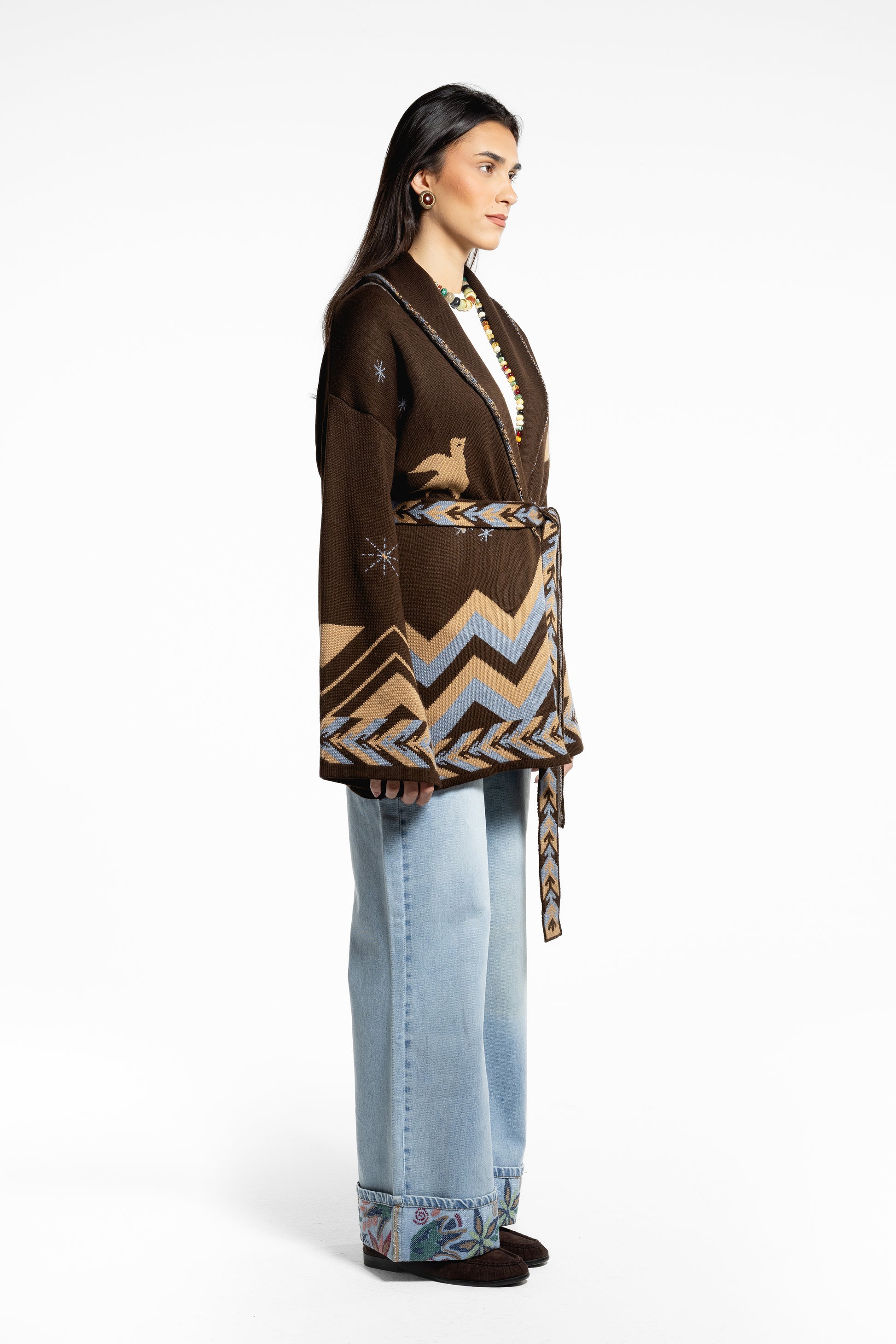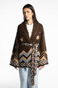 A constellation of zigzag layers and celestial motifs inspired by the sky unfold across the Layla cardigan, expressive, light, and easy to pair for its neutral color palette. The cardigan is complemented by a contrasting belt that doubles as a scarf, offering you versatile styling.