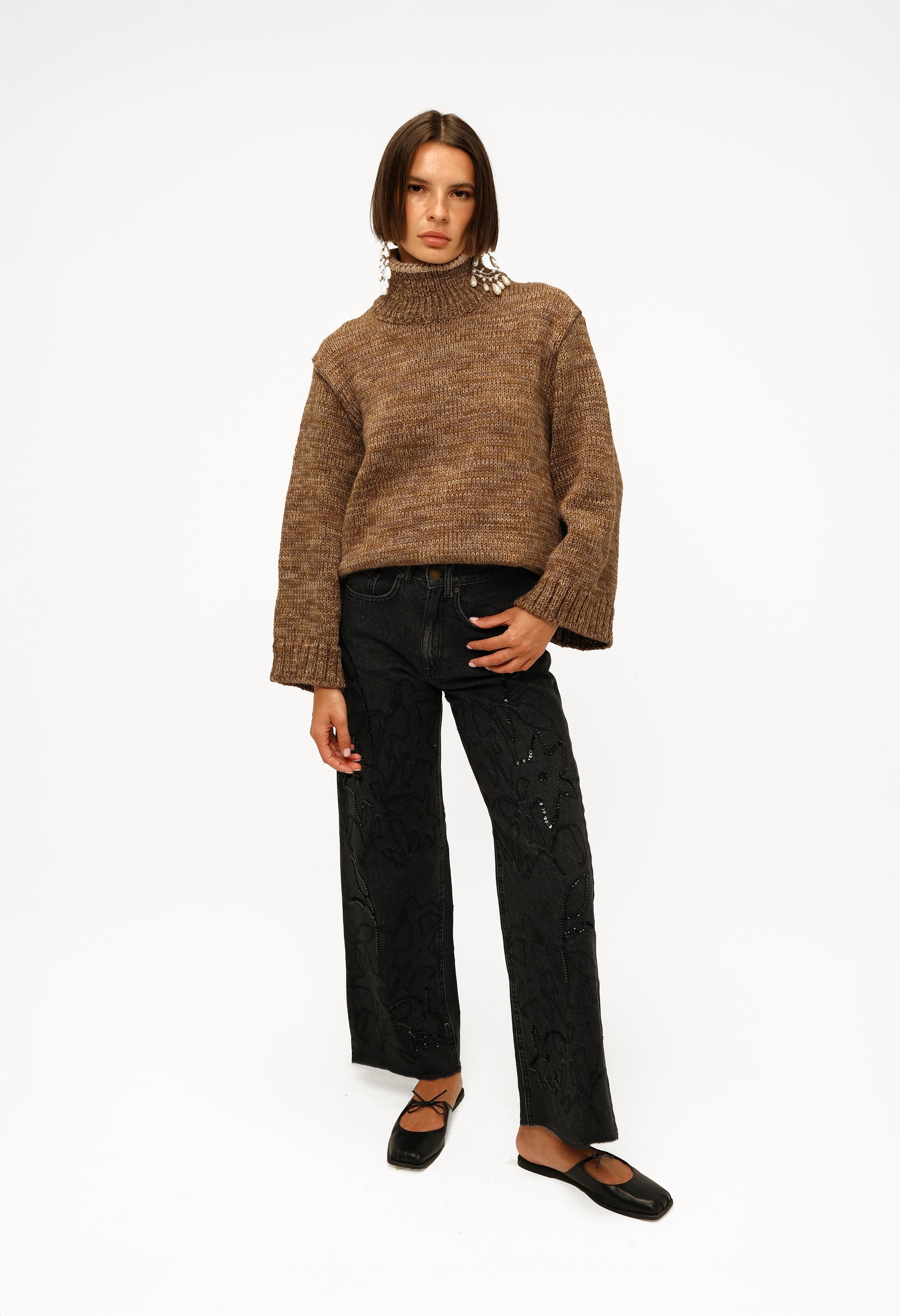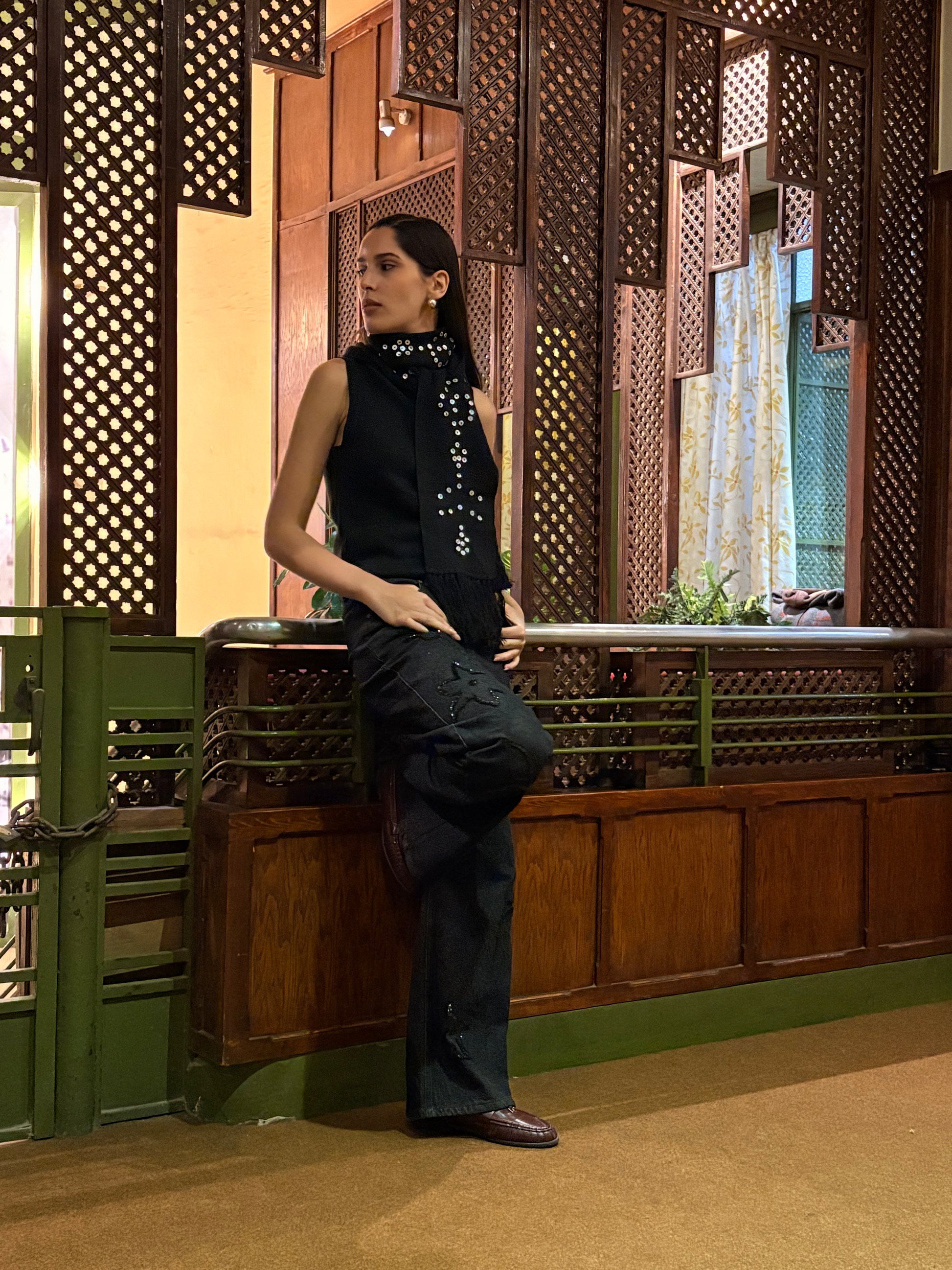 Crafted from 100% cotton in a dark grey wash, these straight-leg pants are defined by intricate floral thread embroidery across the front and back. Hand-embroidered sequins are delicately placed within the motifs, adding depth and a subtle play of light. A considered balance of embroidery, surface texture, and silhouette, making it suitable for day and night.