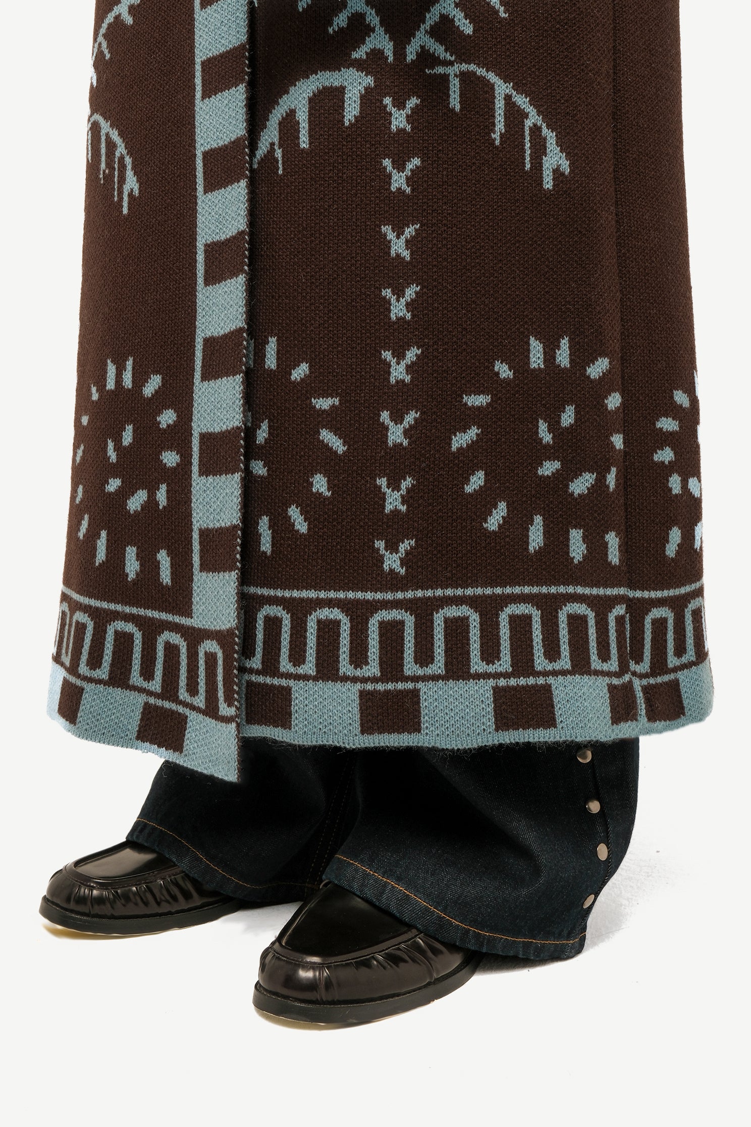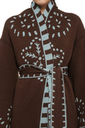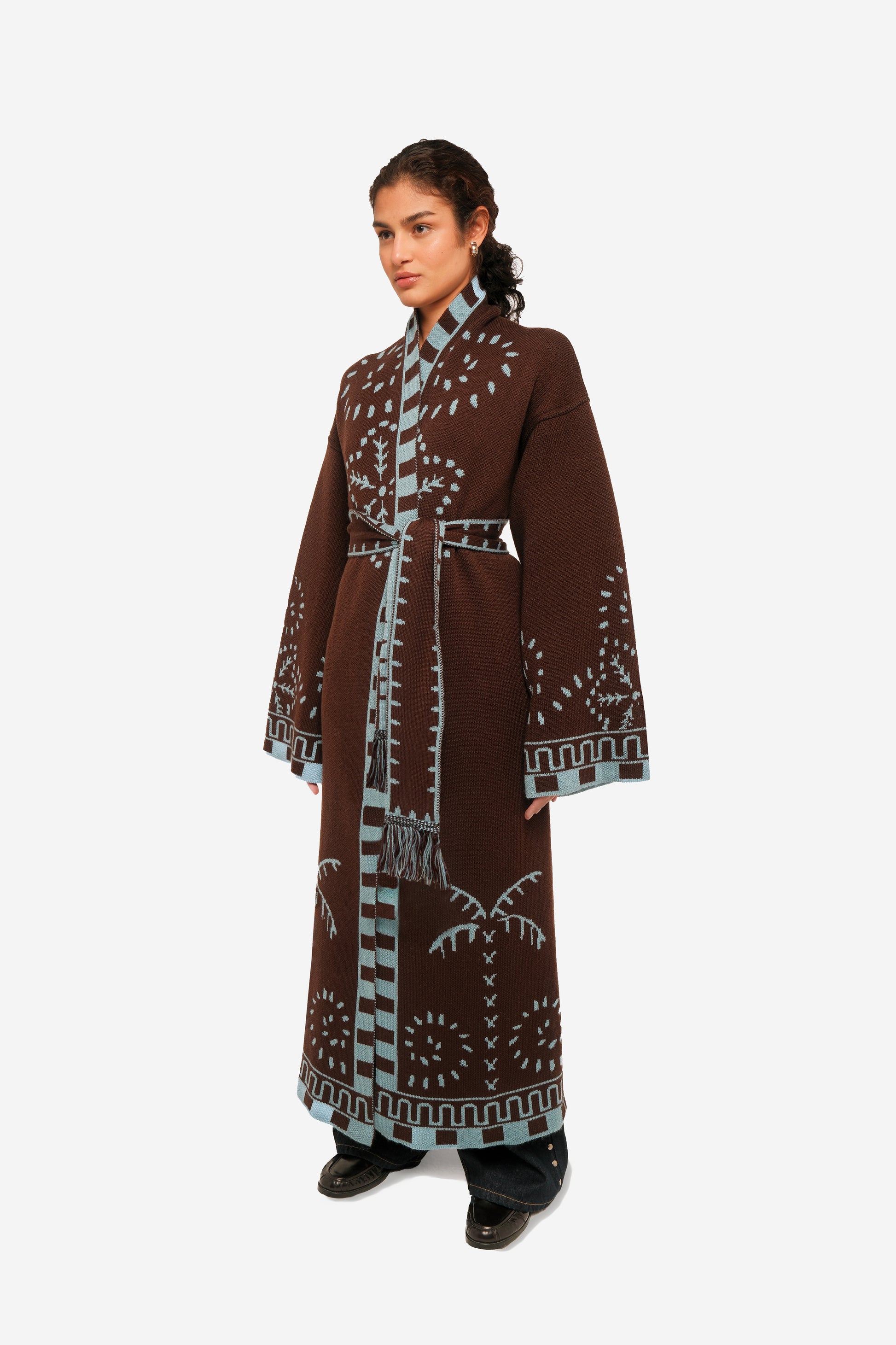 Introducing the Oasis Jacquard Knit Maxi cardigan, a heavier knit tricot with playful RebelCairo symbols along the borders in a denim blue. This cardigan is complemented by a matching belt that doubles as a chic scarf, offering you versatile styling.