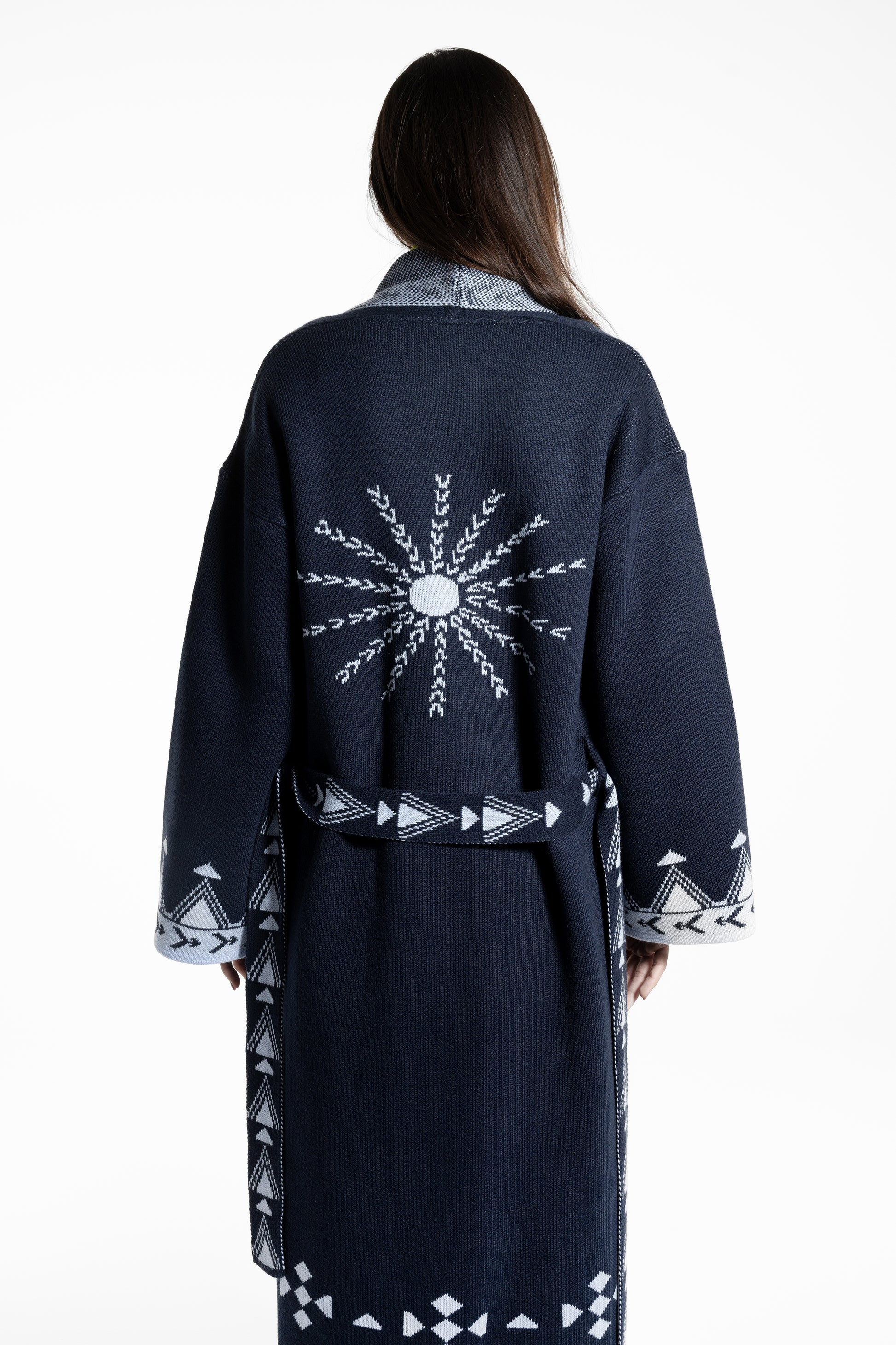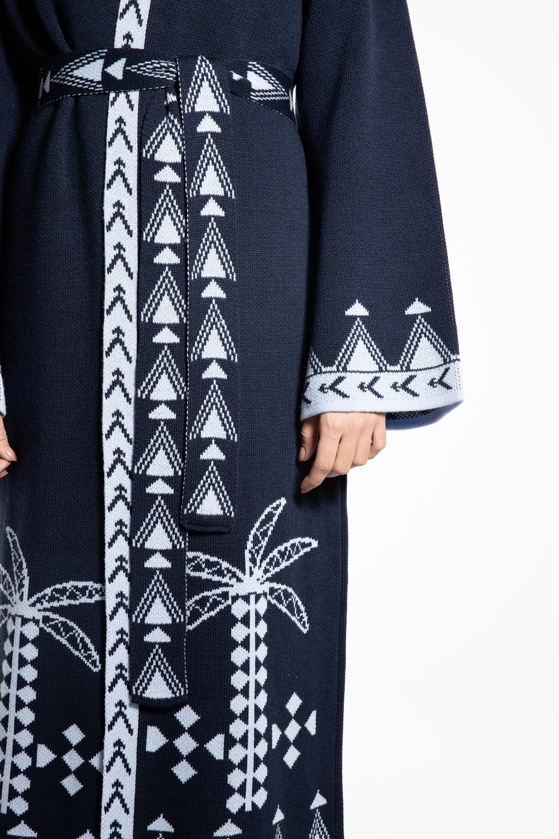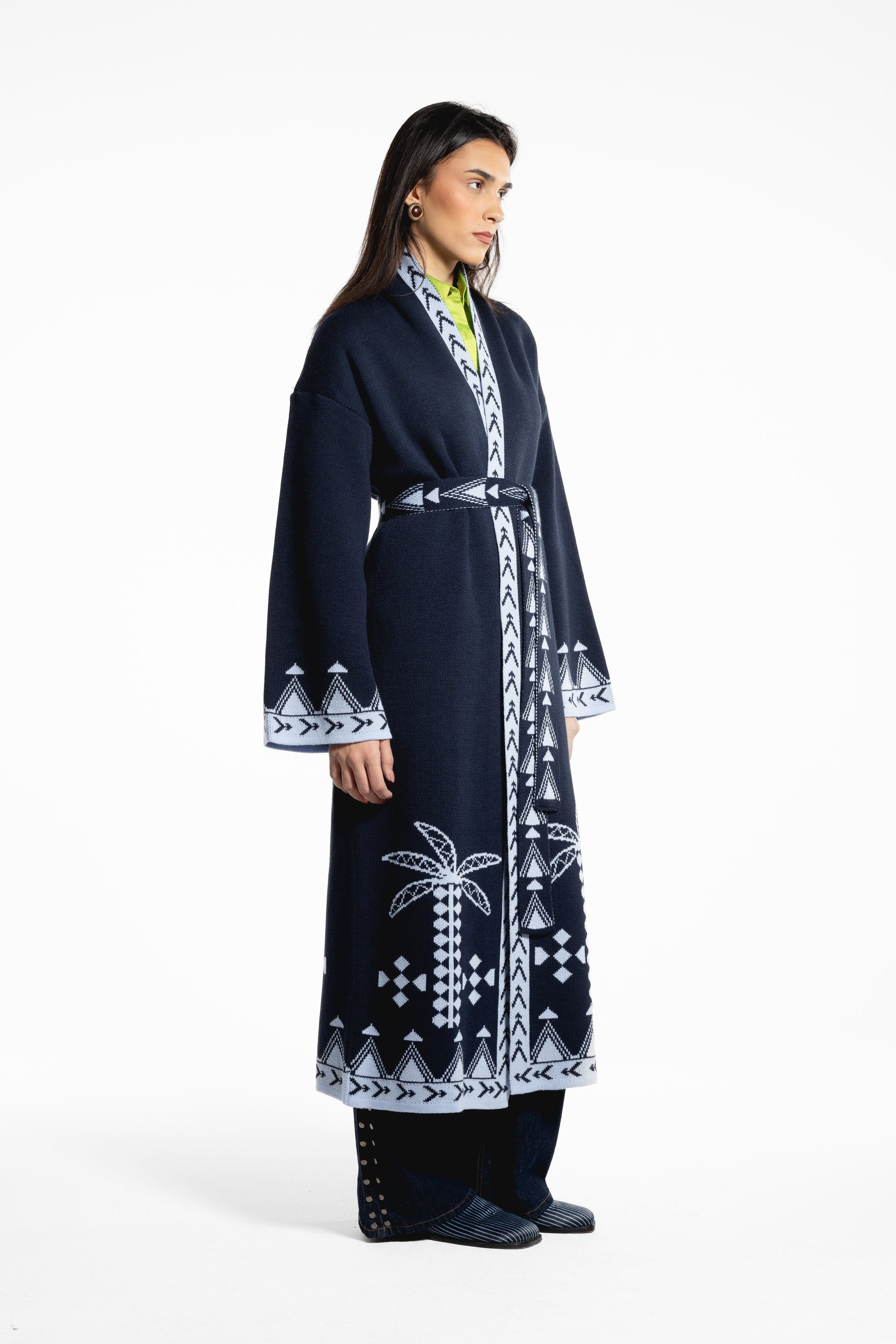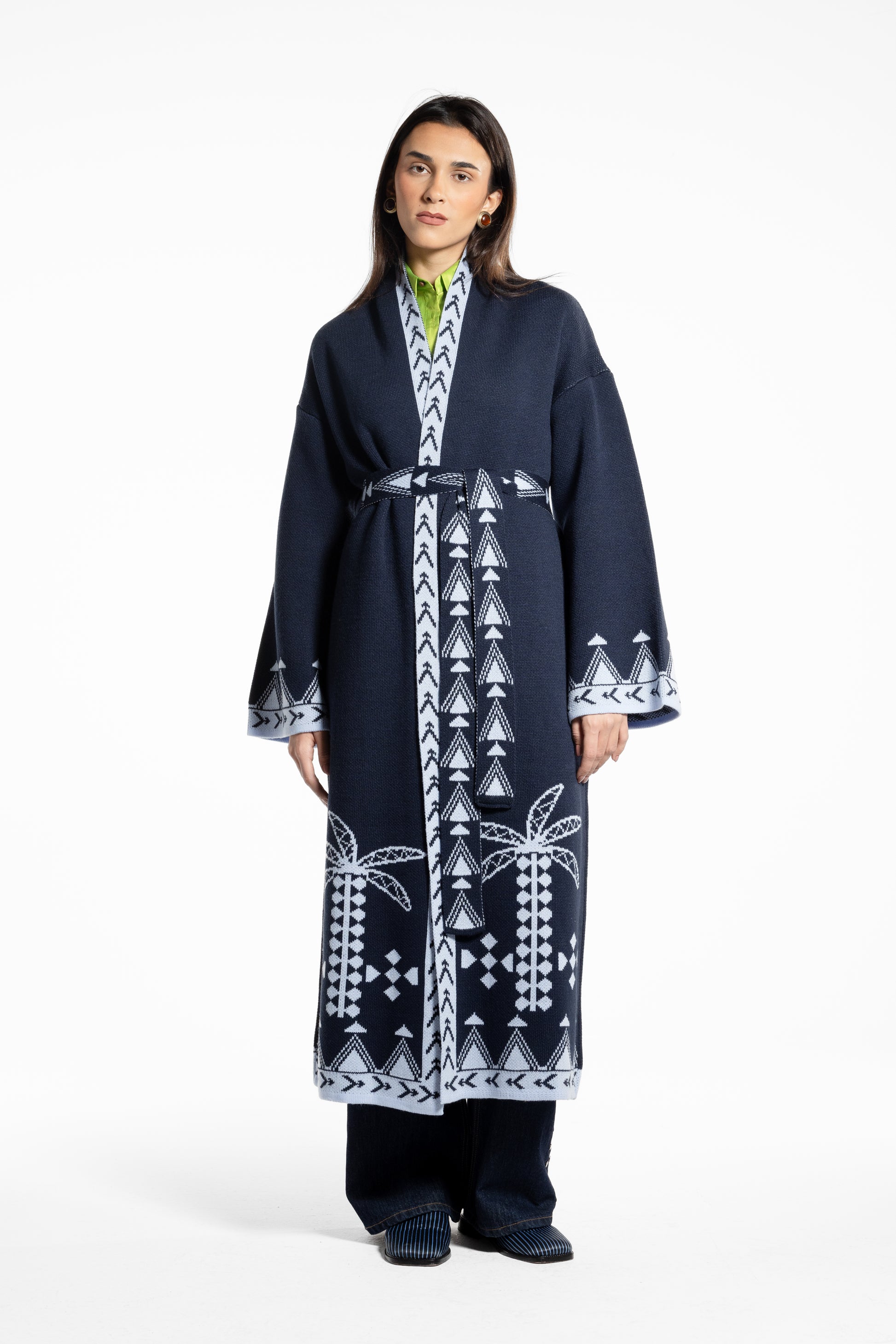 The Rizq Jacquard Knit Maxi Cardigan is crafted in a soft tricot knit, featuring playful RebelCairo motifs woven along the borders in denim blue. Designed as a statement piece, it is finished with a matching belt that can also be styled as a scarf, offering multiple ways to wear: cinched closed, worn open, or layered for the day or night.