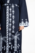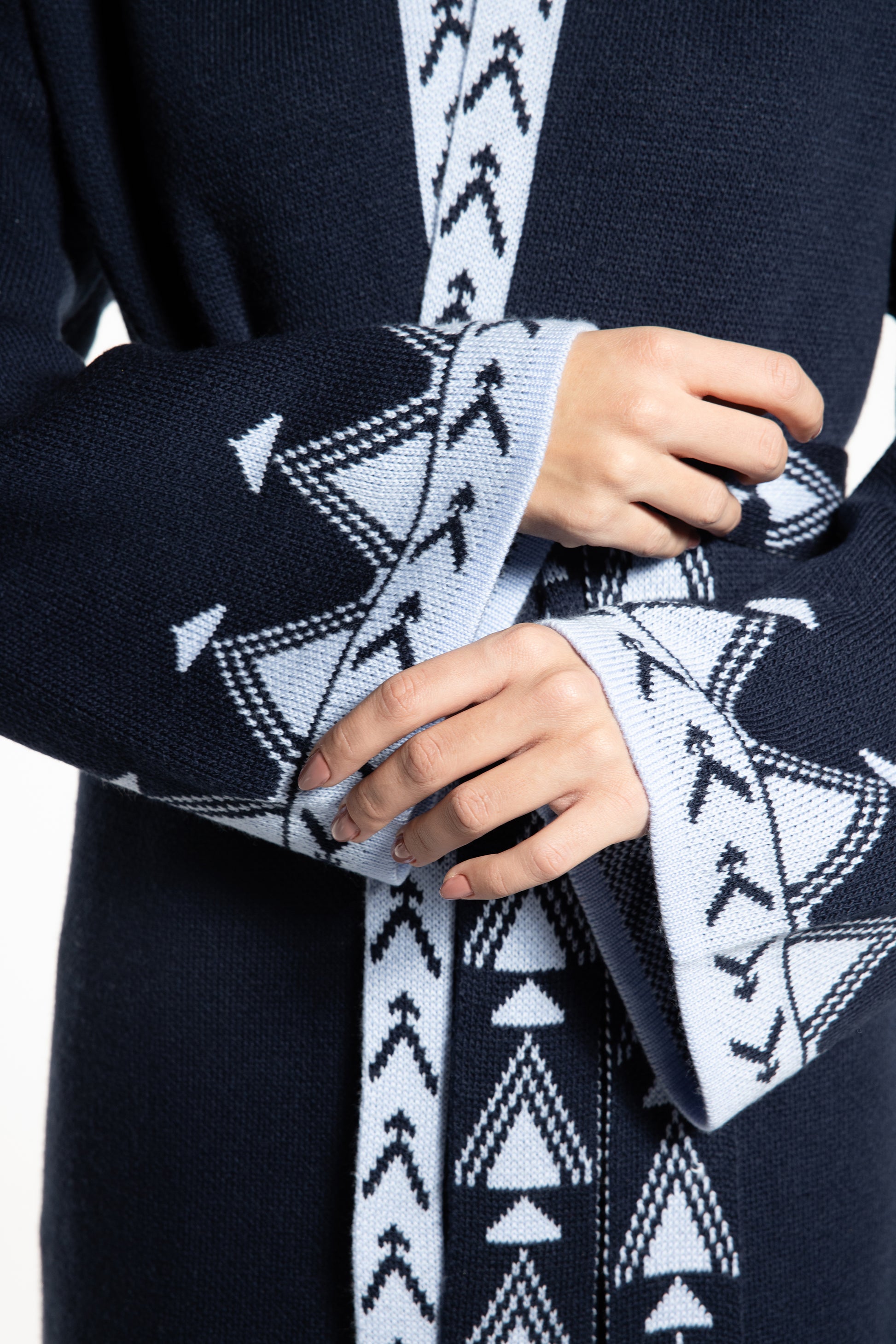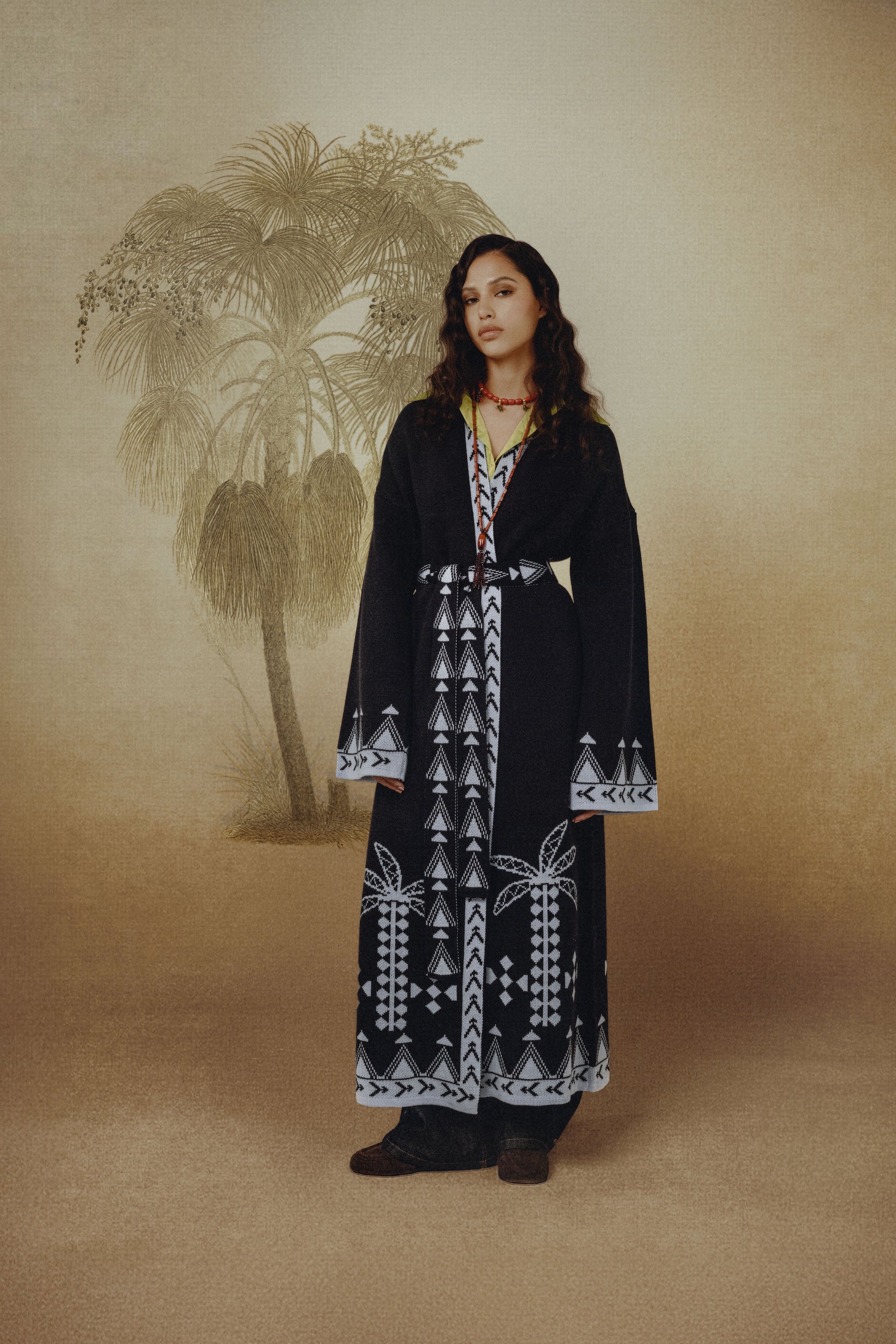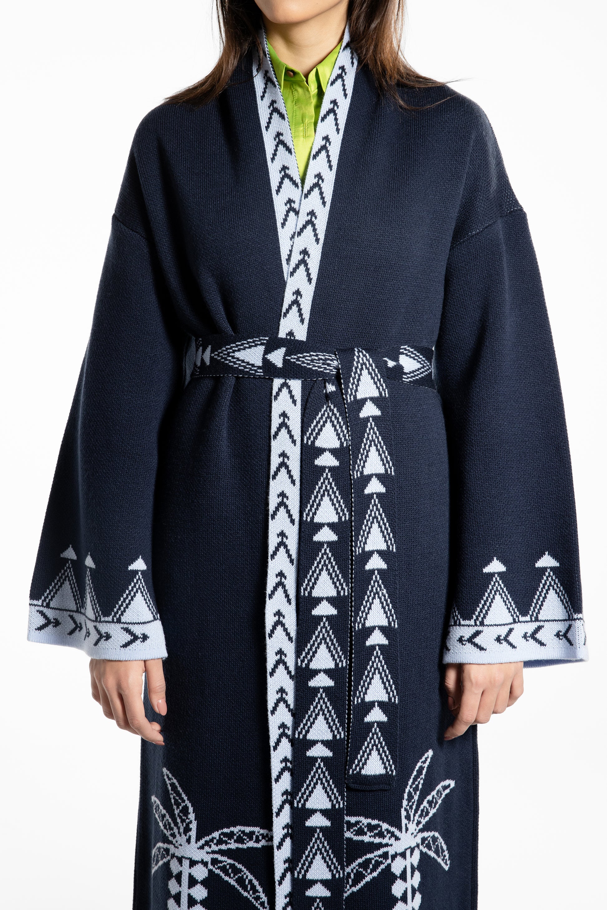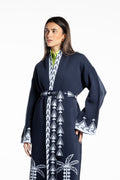 The Rizq Jacquard Knit Maxi Cardigan is crafted in a soft tricot knit, featuring playful RebelCairo motifs woven along the borders in denim blue. Designed as a statement piece, it is finished with a matching belt that can also be styled as a scarf, offering multiple ways to wear: cinched closed, worn open, or layered for the day or night.