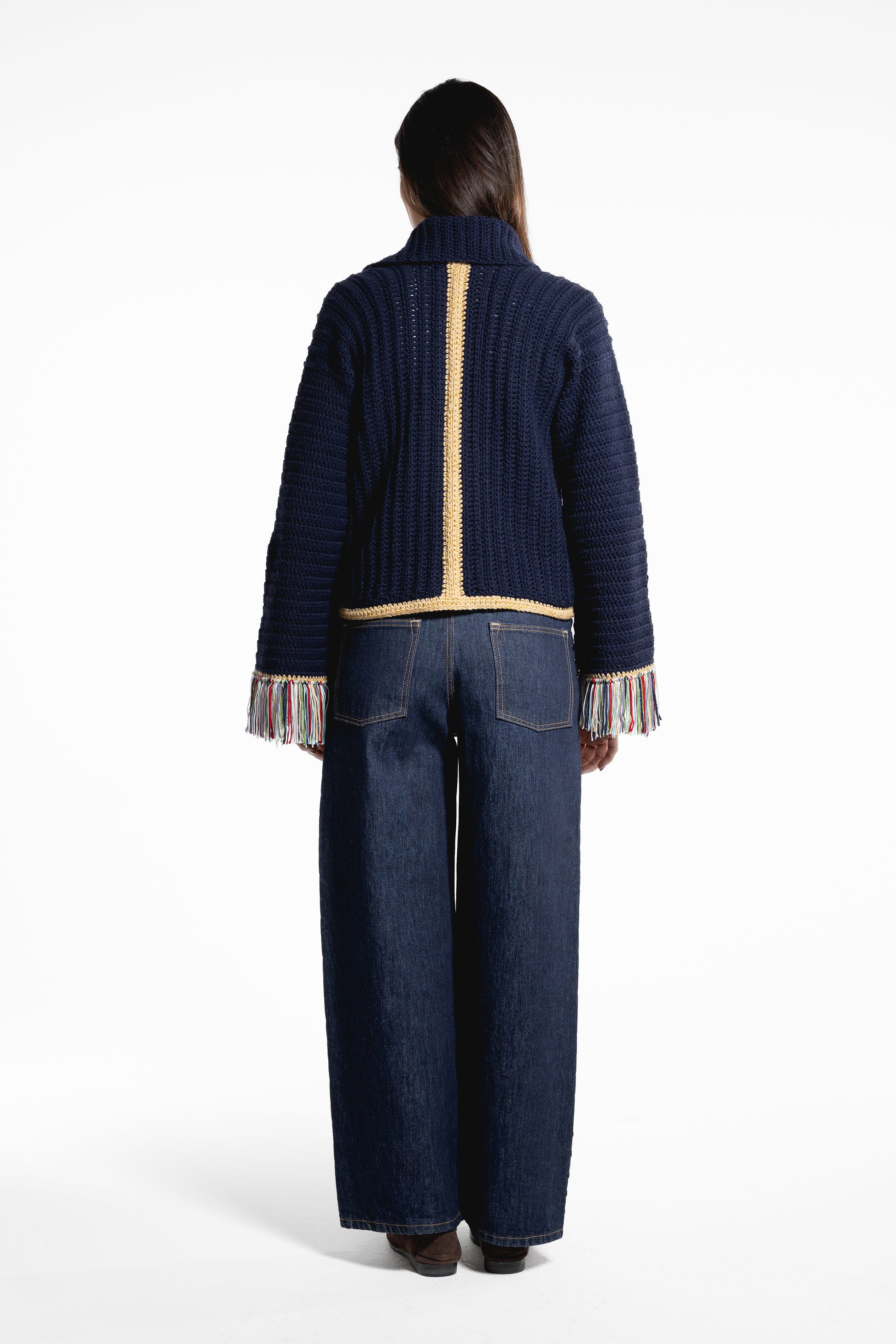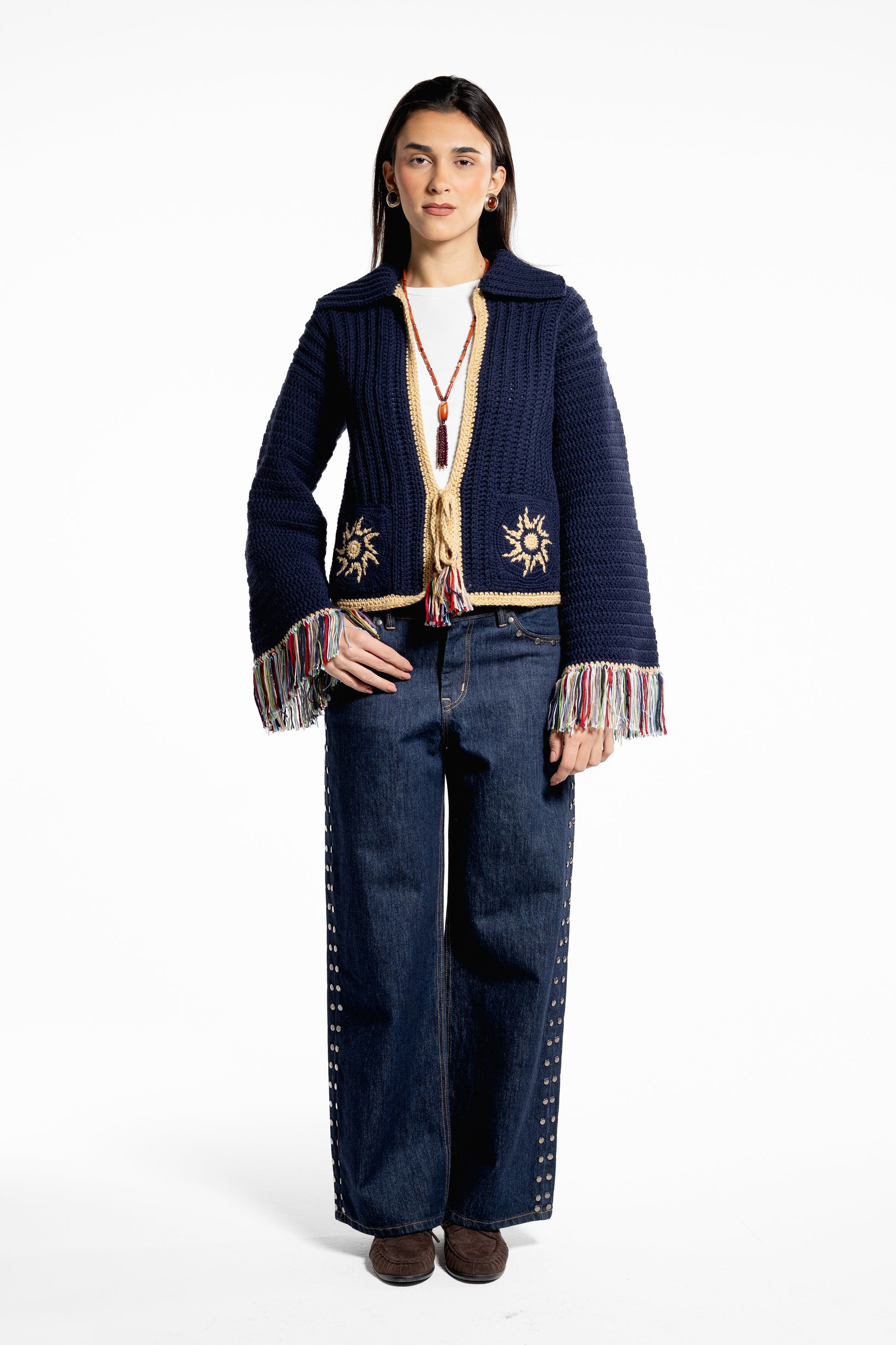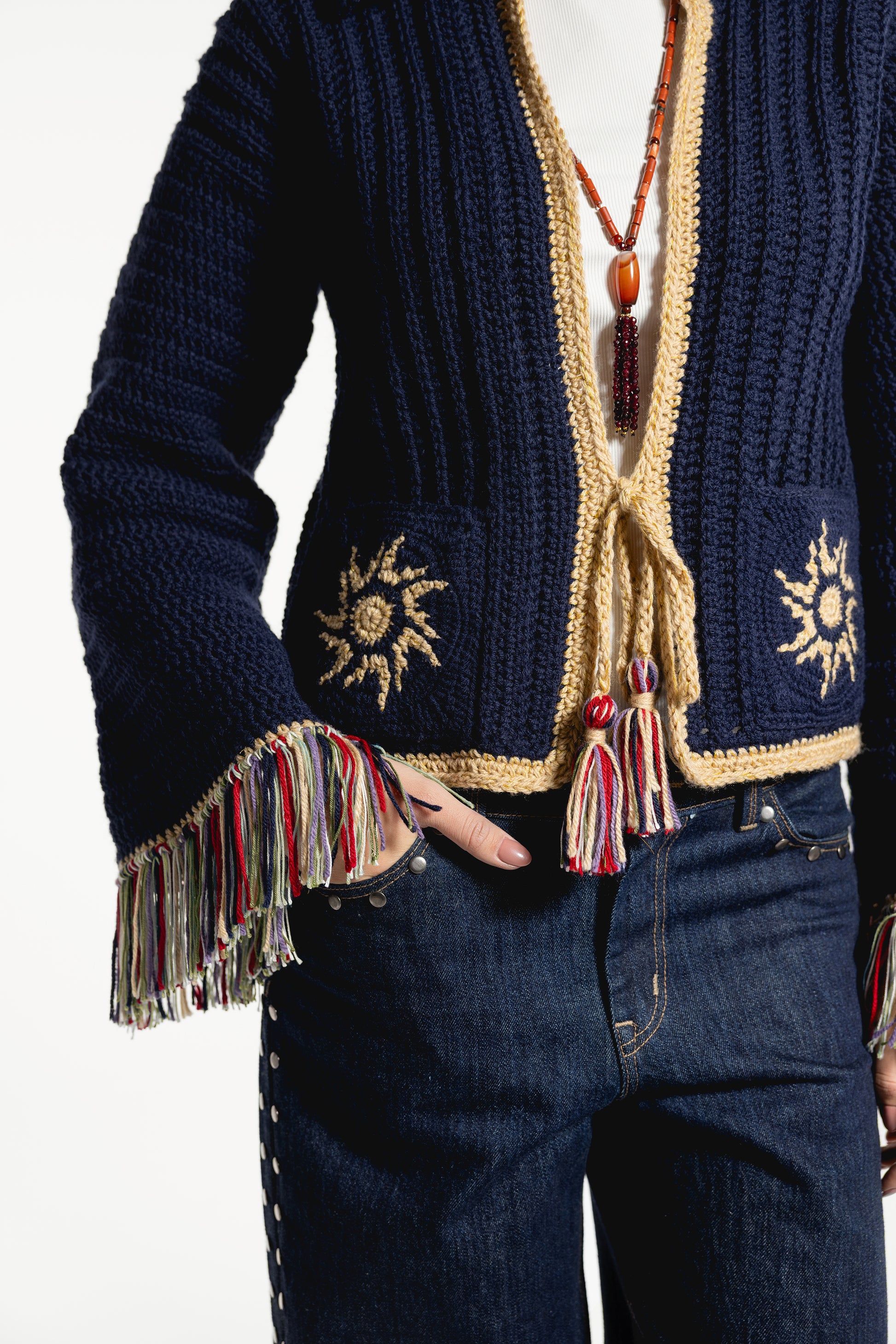 The Shamousa cropped crochet cardigan is hand-made in a navy base with gold accent trimmings, featuring two front pockets detailed with a sun in motion motif. Colorful hand-knotted fringes add movement to the sleeves. A tassel-ended tie closure allows for an adjustable finish.