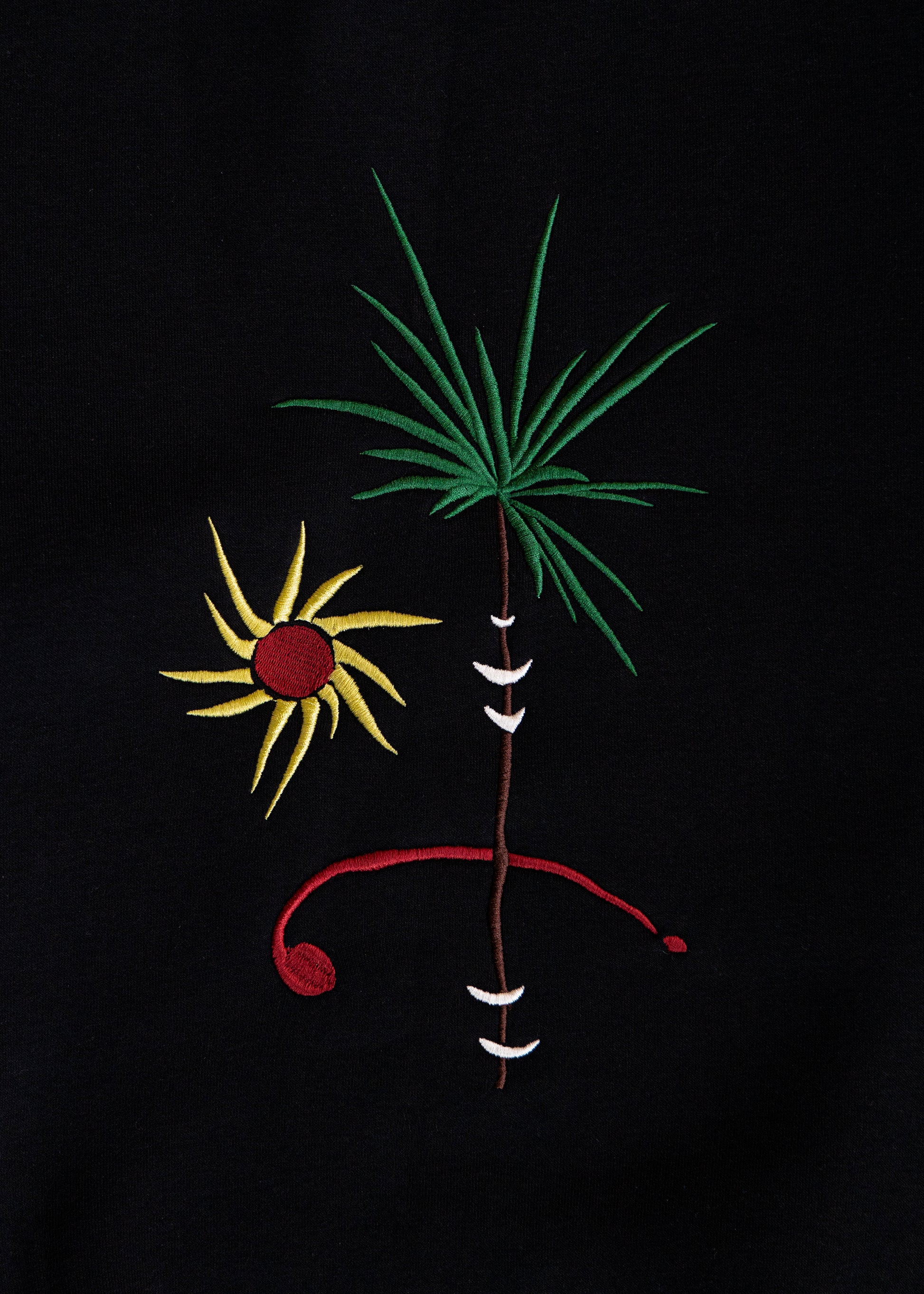 100% cotton. Soft, heavy-weight material. Front and back embroidery in reds, yellows, and touches of brown, green and white. Double-padded hood.